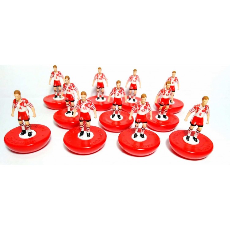 Subbuteo Andrew Table Soccer Denmark 1992 European Champions away kit on classic Hasbro bases